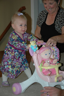 We celebrated with the rest of our family on Saturday. Both sets of Laina’s grandparents, her great grandfather (Charlie), great grandmother (Nana) and great aunt (Pam) spent the day with us. We spent quite a bit of time being entertained by Laina pushing her new stroller around. It was hysterical. As with most things, she pushed that thing around with gusto! What a little character she is. She received many generous gifts–thank you everyone!