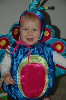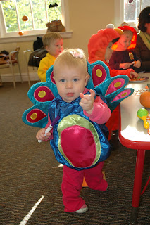 When Laina was a few months old, she was drawn to a certain book that had a colorful peacock in it. She studied this little thing endlessly. So when we ran across a peacock costume online, we just couldn’t pass it up. She was able to wear the costume several times, and I swear I found it to be more hilarious each time. We went to a Halloween party hosted by the mom’s group in our neighborhood, and it was so much fun to see all of the little ones dressed up. It was especially funny to watch Laina and her pals stare at each other in these costumes and wonder what was going on!! There was a lot of tugging on bunny ears and monkey tails going on. Too cute. We also went to a couple other Halloween gatherings, and Laina really took a liking to playing the part. Here are a few pictures of our little peacock.