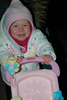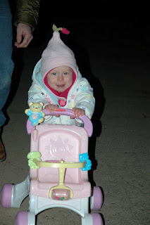 The other night, the three of us went outside after dinner to take a relaxing stroll. We thought it would give Laina a chance to start winding down for the evening. We took the toy stroller she got for her birthday with us so she could walk with it. We should have known that this would not serve the purpose of winding her down! 😉 Every time she gets behind that thing, she turns into a different person. It’s like she just can’t contain herself…she just gets SO excited. It’s adorable to watch (and makes us laugh so hard!) She does most things with enthusiasm, but this is just a different level! Here are a few pics:
