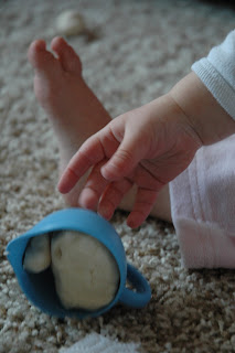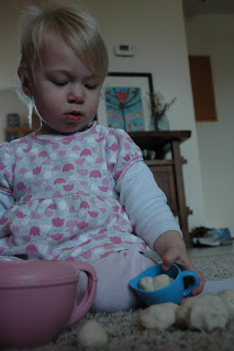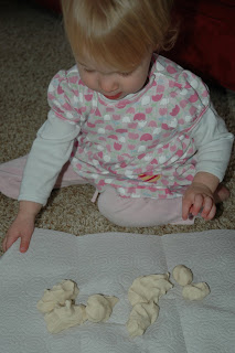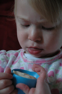 Several weeks ago (on Laina’s 18 month bday), I made some play dough for us to play with. I made sure to say “us” because I happened to enjoy it too! Laina was pretty fascinated by the texture of the play dough, and spent a lot of time studying it, squishing it, and pretending to eat it. She also made requests for Mommy to make certain things out of the play dough…bananas, grapes, apples, pancakes.
