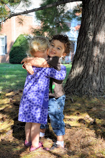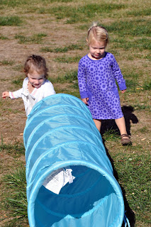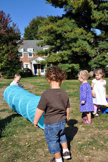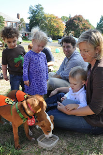 We set up some toys outside in our courtyard for the kids to play with for a while, and then we had some special visitors join us. The Humane Society was awesome enough to bring a couple puppies for the kids. Vanessa and Veronica were adorable, and the adults loved having them there as much as the kids did. Laina was very excited, and gave them lots of hugs and kisses. After playtime with the puppies, we headed inside to have lunch and pumpkin cupcakes. Laina loved having everyone sing Happy Birthday to her (considering she sings that song all the time!!), and she got a kick out of blowing out the candles.