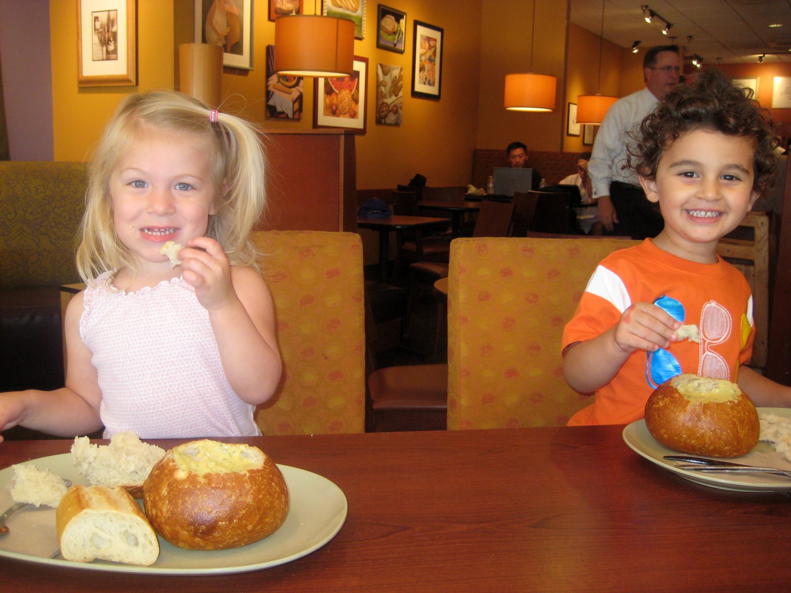 We’ve had such a good time at JW Tumbles for the past couple years, and the last week was no exception. During the last couple sessions, we had a tradition of going to Panera after class with Melody, Sameh and Nura. Every Friday, Laina and Sameh looked forward to their bread bowls filled with Broccoli Cheddar Soup. I think they enjoyed this special treat as much as they did the class. So many fond memories of these days!