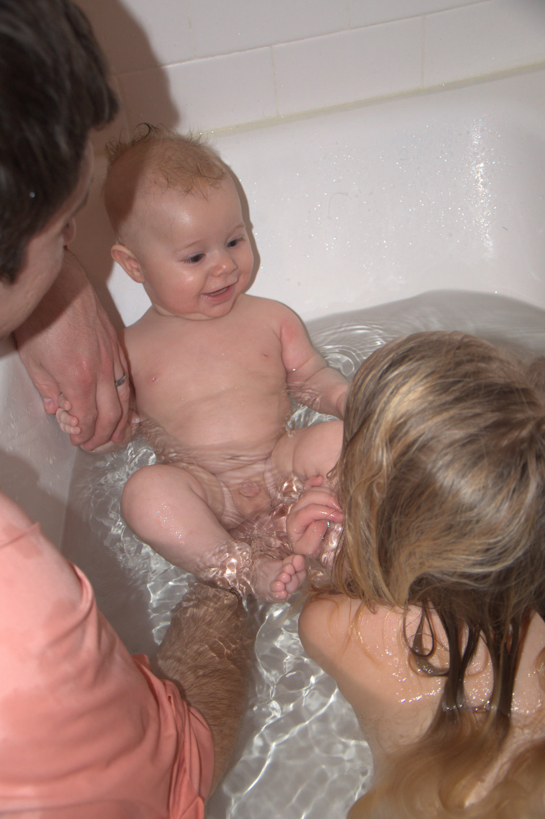 Last night, Sam was bathing Laina and decided it would be fun for E to hop in the bath, too. Elijah was a bit unsure for the first couple minutes, but ended up loving the big bathtub! Who needs a baby bathtub now? Elijah was totally entertained by Laina splashing him a little and showing him all of the bath toys. He also loved kicking his little (actually, not so little) legs all around. It was just too cute to watch. The last picture is post-bath–I think Elijah was feeling pretty good!