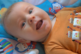 What else? Well, he seems to really enjoy the wind. He smiles and squeals when the wind smacks him in the face. He also is all smiles when we drop off/pick up Laina at preschool. I think he just digs seeing all the kids. Of course, the biggest smile is reserved for Laina when she comes running out after school. So cute.