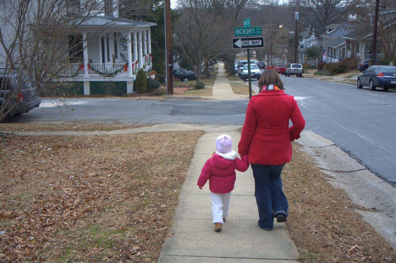 We chose the coldest of day of the year (literally) to go for a stroll down to the “Avenue,” but it was well worth it. Laina has a blast checking out all the houses, and was thrilled that we live in a hilly neighborhood. “Look how big this hill is!” we heard over and over. We stopped by the playground for a while to play for a bit, then headed to Los Tios for a quick bite. I smile every time I think about our new neighborhood. Our neighbors have been great so far, and we love that each of the homes in Del Ray are full of character. And of course, that we can walk to the playgrounds, restaurants, shops, etc.