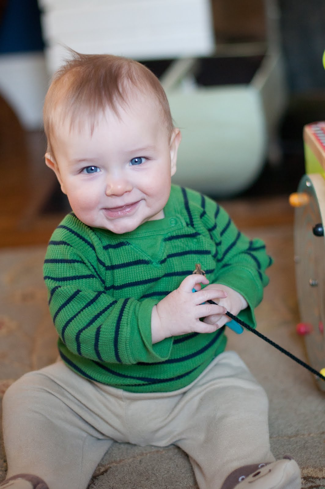 He is definitely mobile at this point…and his primary means of getting around these days is his army crawl. Just a few days ago, he started pulling up! I walked into the kitchen today for a minute or two and came back to the living room only to find that he pulled himself up on the coffee table. The smile he sent my way was full of pride :). Only problem with all this mobility is that he finds it much more interesting than taking his naps. Hopefully this is short lived, and nap time will resume to being more than 20 minutes!