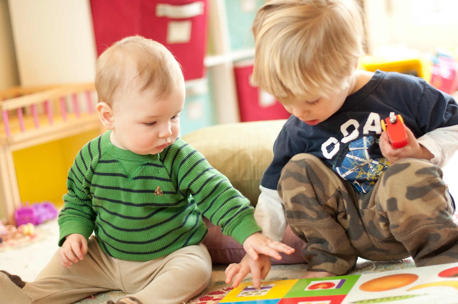 It’s been interesting to watch the evolution of the relationship between the boys. Now that Austin is moving, talking, laughing, etc, the boys are starting to interact more and play side by side. There are certainly plenty of moments that we have to remind E to share with Austin, etc…but much of the time Elijah is happy to have Austin around and he picks out some toys for Austin to play with.